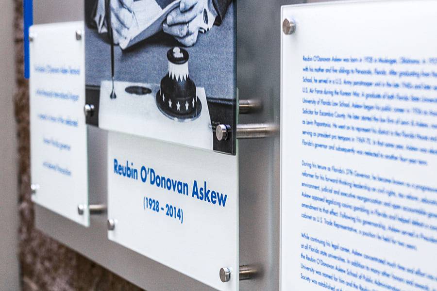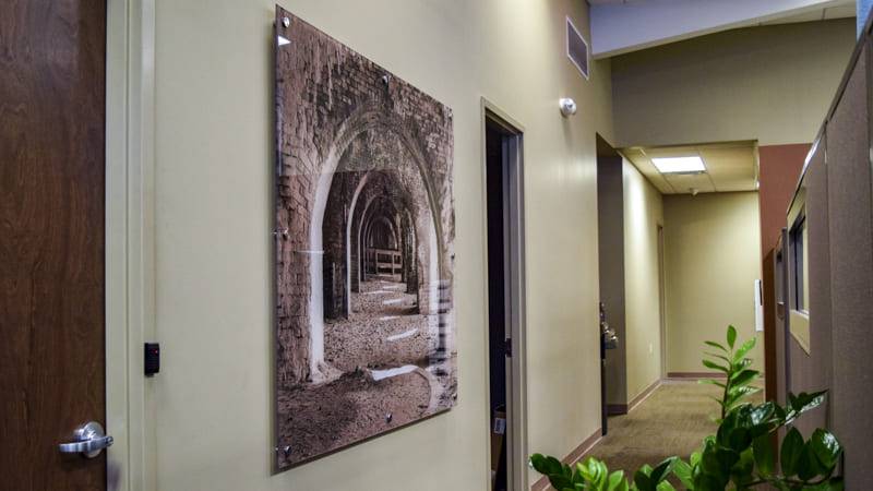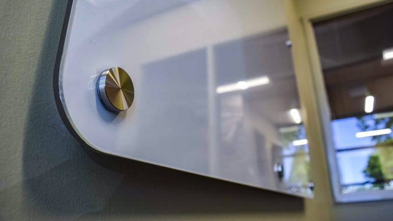 Transparent and durable, acrylic is the modern glass substitute of our choice. This versatile cast polymer has a frameless appearance and adds a sophisticated touch to wall displays when combined with high-quality spun aluminum standoffs. We can create tamper-proof architectural signs for you that are utilitarian and informative or expressive of the brand culture. Glossy acrylic posters make simply beautiful additions to offices, lobbies, and meeting rooms, and historical photos and portraits shine and gain dimension when second-surface applied to acrylic panels. These standoff displays help prevent vandalism and other natural damage by having the imagery on the back of the display, but names, dates, ranks, or logos can easily be adhered to the front of these panels to create a natural dropshadow. Our experienced team can also create custom shaped whiteboards or magnetic dry-erase displays with acrylic panels.